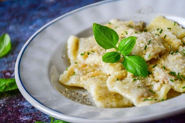 - Ravioles farcies à la ricotta, sauce au Champagne & copeaux de parmesan.
