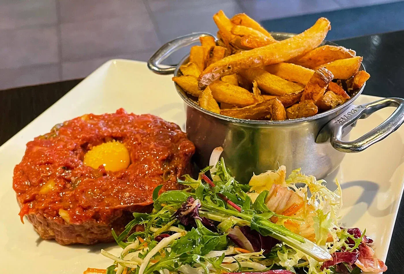 Crispy de volaille ou poisson du jour, frites fraiches ou légumes.